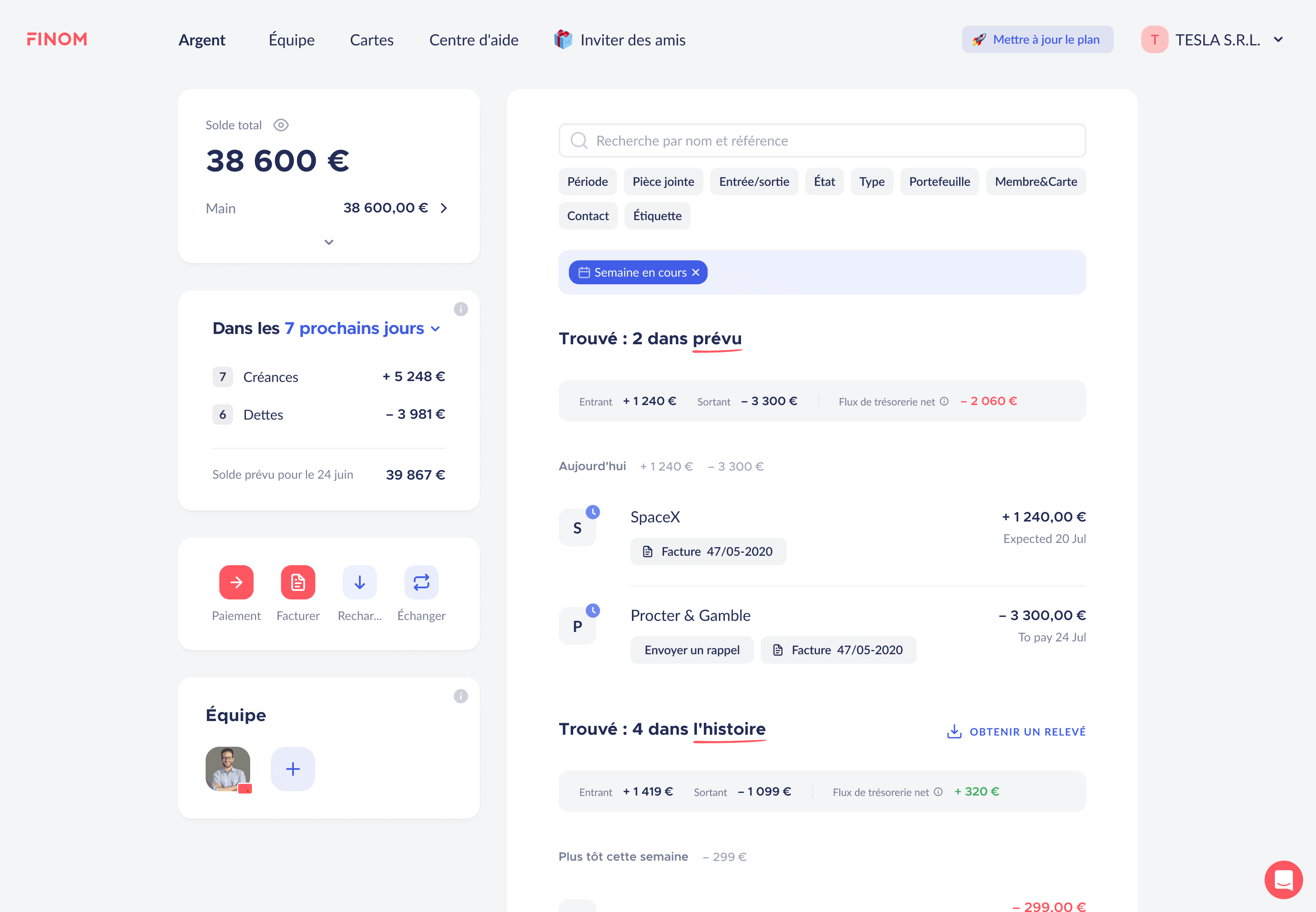 Pour finir, Finom vous propose une gestion centralisée de toutes vos transactions depuis un tableau de bords intuitifs qui vous permet de suivre en temps réel l’ensemble des activités liés à votre compte bancaire professionnel..