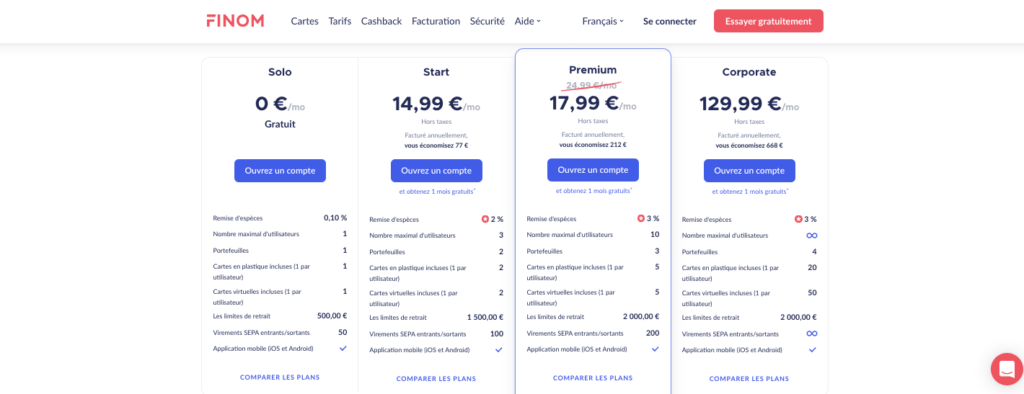 - Formule Corporate: la dernière offre payante de Finom avec tous les avantages proposés par la néobanque hollandaise : un nombre illimité d’utilisateurs pour chaque compte (essentiel pour les grandes entreprises), un nombre illimité de cartes bancaires physiques et virtuelles, jusqu’à 4 comptes gérés, un nombre illimité de virements SEPA, un plafond de retrait à 2 000€ et un Cashback à 3%. La formule Corporate est accessible pour 129€ par mois HT ou bien à 99€ HT par mois en abonnement annuel.