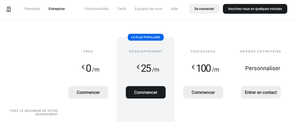 - Développement : c’est la première offre payante de Revolut Business et comporte les mêmes options et services que l’offre Ultimate pour les travailleurs indépendants. Le prix est d’ailleurs le même, car Revolut Business Développement est facturé 25€ par mois.