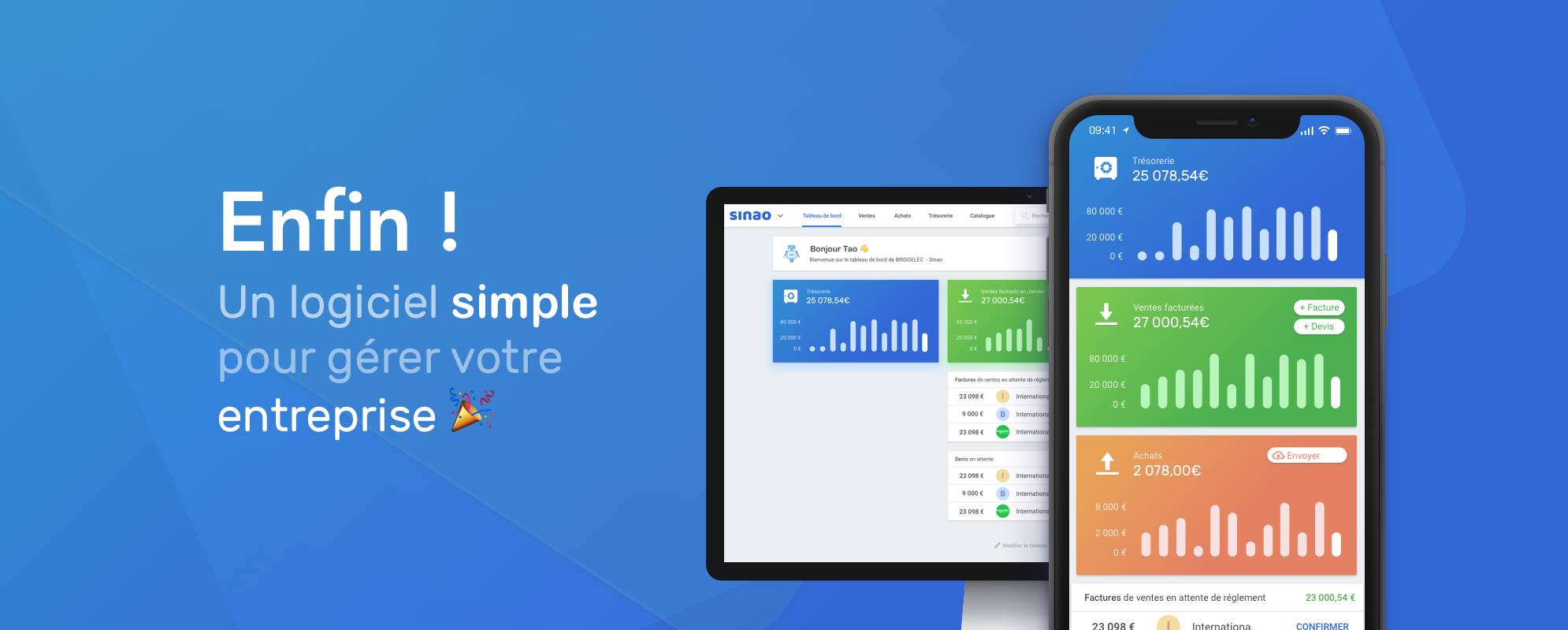 10. Sinao : Sinao est sans aucun doute l’un des logiciels les plus ergonomiques et les plus faciles à prendre en main du marché. Sinao s’adresse aux autoentrepreneurs, aux PME/TPE, aux travailleurs indépendants ainsi qu’aux artisans. On retrouvera notamment sur Sinao la fonctionnalité d’édition et d’envoi de devis/facture, les outils de gestion comptable, la fonctionnalité d’import et d’export de données comptables, ainsi que la gestion des stocks et des clients. Sinao est accessible à partir de 7,5€ par mois seulement.